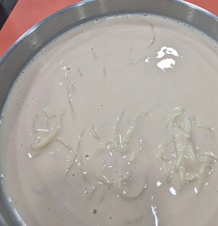 이곳의 콩물은 1차로 맷돌에서 간 뒤, 다시 믹서기 작업을 통해 아주 곱고 부드러운 질감을 자랑합니다. 거친 입자가 거의 느껴지지 않을 정도로 매끄러워, 미숫가루를 마시는 듯한 고소한 풍미가 입안을 감쌉니다. 기본 간이 되어 있어 별도로 양념을 하지 않아도 부담 없이 먹을 수 있으며, 테이블 위에 준비된 소금이나 설탕을 기호에 따라 조금 더해도 좋습니다. 지역에 따라 콩국수의 간을 소금으로 할지 설탕으로 할지 선호가 나뉘는 점을 고려한 세심한 배려가 엿보이는 부분입니다.